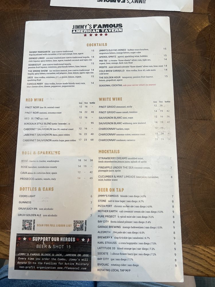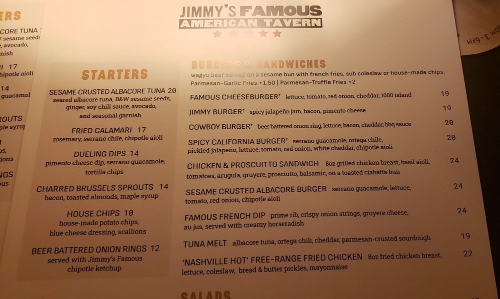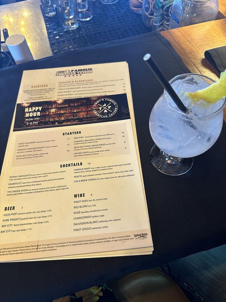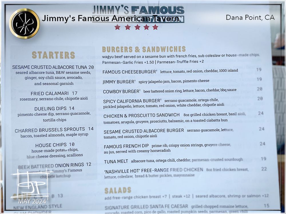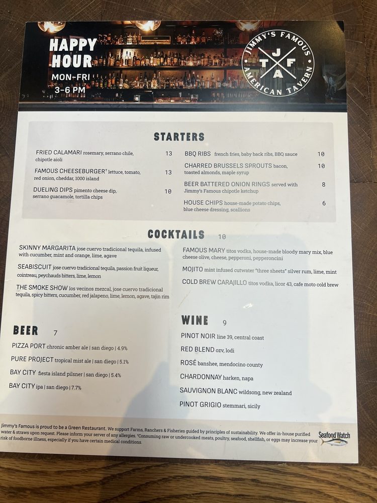"Introducing the menu at Jimmy’s Famous American Tavern, located in Dana Point, CA, offers a diverse range of starters, burgers, sandwiches, soups, and salads. The restaurant provides various amenities such as reservations, delivery, takeout, vegan and vegetarian options, wheelchair accessibility, and more. Standout dishes include the Beer Battered Onion Rings, Charred Brussels Sprouts, and Famous French Dip. Customers praise the generous portions, friendly staff, and vibrant atmosphere. Reviews mention favorites like the Fish and Chips, Jalapeno Cheddar Scalloped Potatoes, and the hangover Burger. With a focus on quality ingredients and cozy vibes, Jimmy’s is a must-visit spot for delicious American comfort food in a welcoming setting."