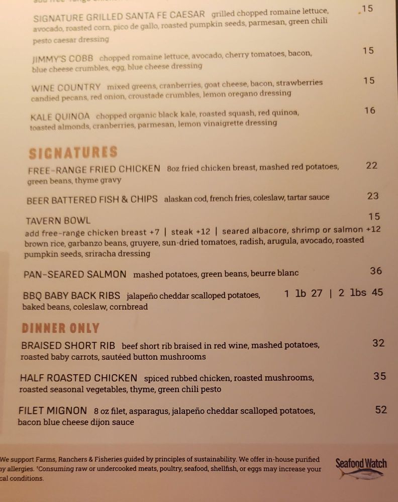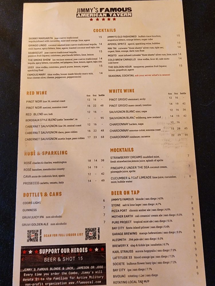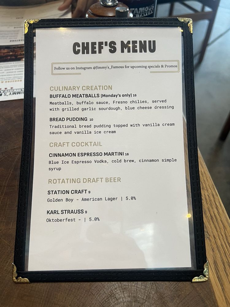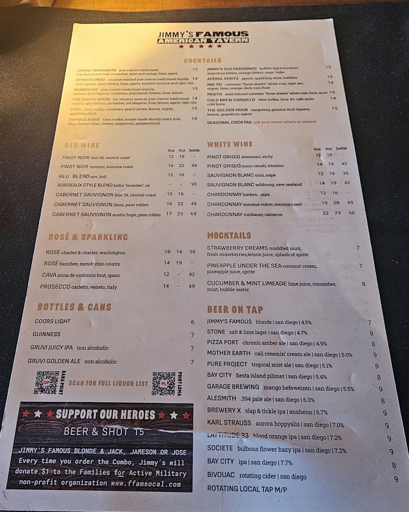 "Introducing the menu at Jimmy’s Famous American Tavern, located in Dana Point, CA, offers a diverse range of starters, burgers, sandwiches, soups, and salads. The restaurant provides various amenities such as reservations, delivery, takeout, vegan and vegetarian options, wheelchair accessibility, and more. Standout dishes include the Beer Battered Onion Rings, Charred Brussels Sprouts, and Famous French Dip. Customers praise the generous portions, friendly staff, and vibrant atmosphere. Reviews mention favorites like the Fish and Chips, Jalapeno Cheddar Scalloped Potatoes, and the hangover Burger. With a focus on quality ingredients and cozy vibes, Jimmy’s is a must-visit spot for delicious American comfort food in a welcoming setting."